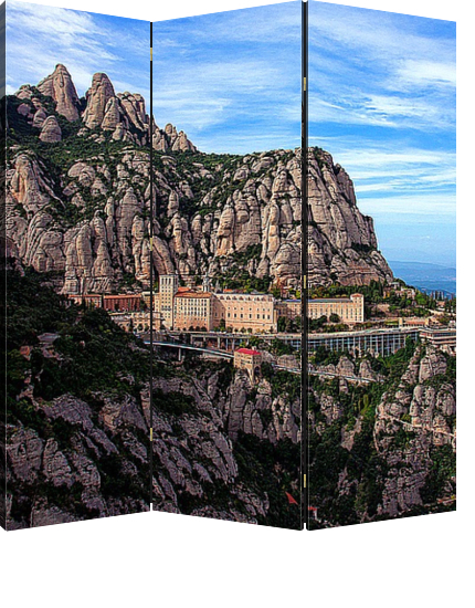 Описание ширмы Монастырь Монсеррат — бенедиктинский монастырь, духовный символ и религиозный центр Каталонии и центр паломничества католиков со всего мира. Монастырь, расположившийся на высоте 725 м над уровнем моря, получил своё название по горной местности Мо