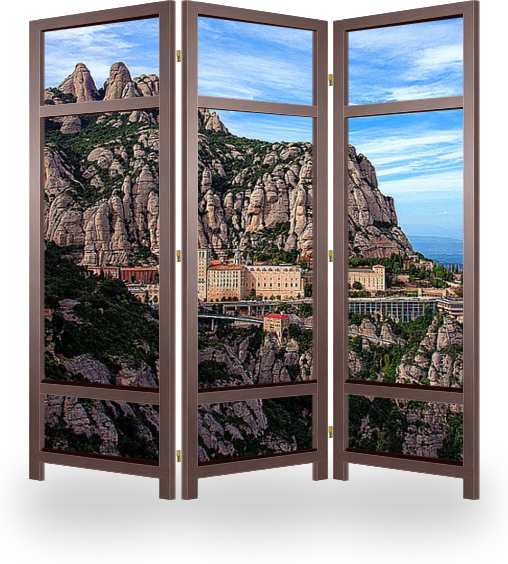Описание ширмы Монастырь Монсеррат — бенедиктинский монастырь, духовный символ и религиозный центр Каталонии и центр паломничества католиков со всего мира. Монастырь, расположившийся на высоте 725 м над уровнем моря, получил своё название по горной местности Мо