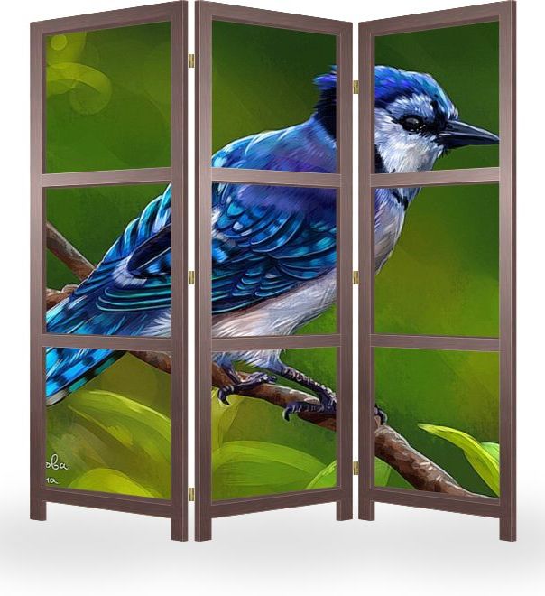 Описание ширмы Голубая сойка — нарядная птица с перьями голубого, белого и чёрного цветов, с чередованием сплошного окраса и полосок. Как и другие врановые, это очень умные птицы. В неволе было зафиксировано использование подручных предметов для добычи пищи, а в др