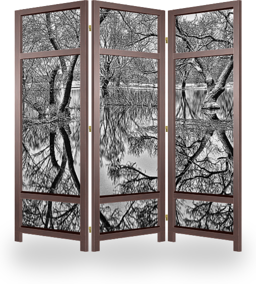 Описание ширмы Весна,река,разлив,рассвет,отражение Весной при разливе рек вода наступает на берега и деревья оказываются в воде. Картина меняется очень быстро и порой принимает такие причудливые картины.