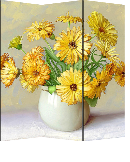 Описание ширмы На светлом столе стоит белая ваза с ярко-желтыми и оранжевыми цветами календулы, народное название ноготки. Это яркие летние неприхотливые цветы всегда создают настроение праздника и положительных эмоций