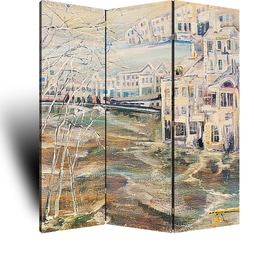 Описание ширмы Городской пейзаж Италии освещен более мягким и близким светом, причем источником его может быть как обыкновенный фонарь, так и блуждающее радужное пятно, прикрытое лёгким утренним туманом.