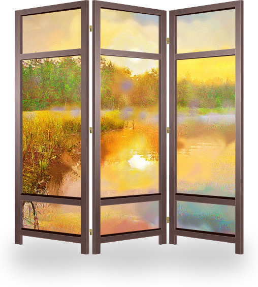 Описание ширмы Озеро на Валдае снято летом рано утром с лодки. Клочья тумана стелятся над берегом и водой. Диск солнца проглядывает сквозь туман. Тишина и покой предсказывают погожий летний день.
