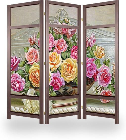 Описание ширмы Этот букет был написан под впечатлением посещения алупкинского розария. Чайные розы поставлены в вазу 18века русской школы фарфора. Роскошный букет расположился на белой мраморной скамье одного из дворцов музея.