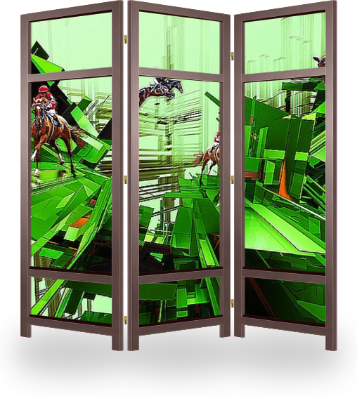 Описание ширмы Коллаж представляет динамичную сцену скачек в абстрактном мире. Дизайн работы прекрасно впишется в интерьер гостиной, комнаты подростка, спортивного клуба.