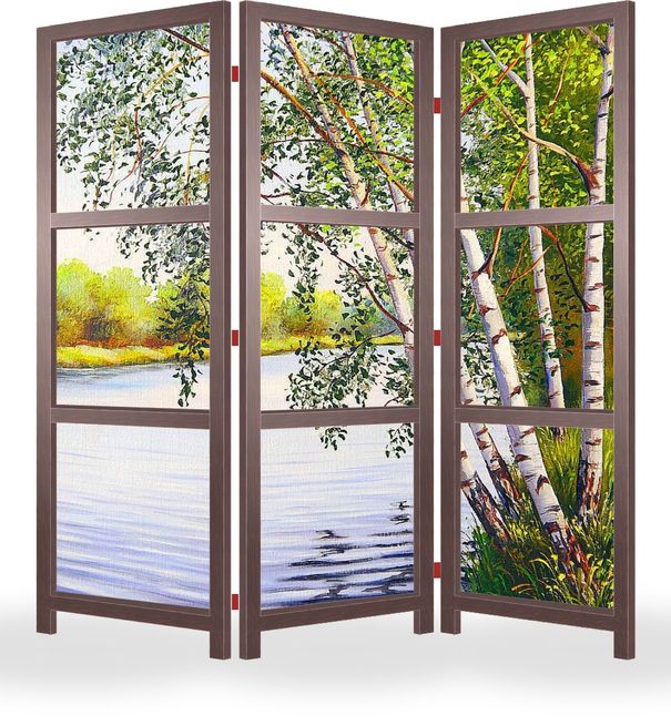 Описание ширмы Стройные березки над рекой стоят. Склонившись ветвями к воде...пейзаж средней полосы России. Прекрасно подойдет к интерьеру любителя российской природы.