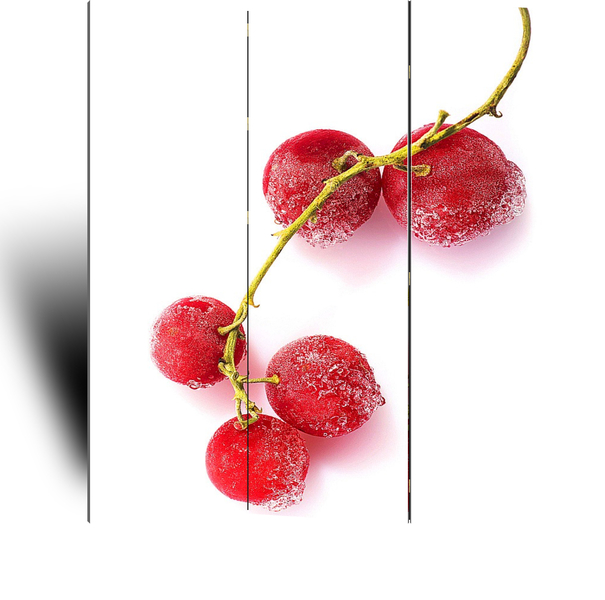 Описание ширмы Веточка замороженной красной смородины на белом фоне. Предметная съёмка, демонстрирующая неувядаемую красоту вкусной летней ягоды, которая продолжает радовать своей привлекательностью даже зимой.