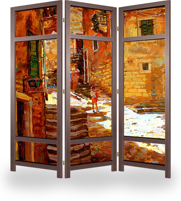 Описание ширмы Работа "На улочках старого Котора" была написана во время международного пленэра в Черногории. На берегу великолепного Боко-Которского залива расположился старинный город Котор. излюбленное место для посещения туристами всего мира.