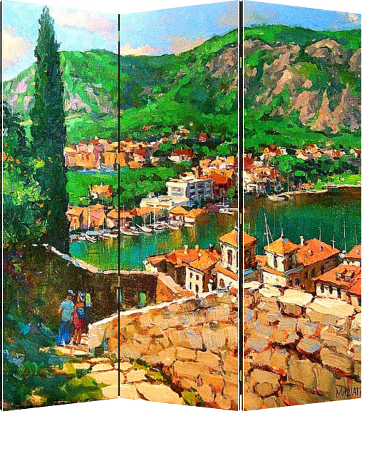 Описание ширмы Работа была написана во время летнего международного пленэра в Черногории. На берегу великолепного Боко-Которского залива лежит древний город Котор, любимое место для посещения туристов всех стран.