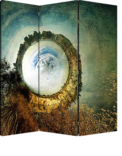 Описание ширмы "Белая дыра" - это изображение фантастического мира, непонятного и загадочного, созданного тем не менее из узнаваемых объектов мира нашего, реального. Изображение сделано при помощи графических редакторов.