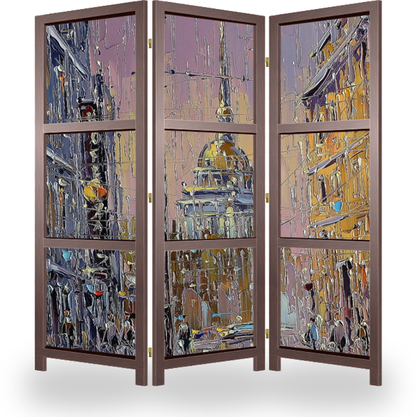 Описание ширмы Картина маслом , написана мастихином (Мастихин (от итал. mestichino) — специальный нож или мастерок, использующийся в масляной живописи для смешивания красок, очистки палитры или нанесения густой краски на холст. Иногда мастихин употребляется вместо