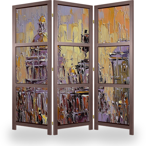 Описание ширмы Картина маслом , написана мастихином (Мастихин (от итал. mestichino) — специальный нож или мастерок, использующийся в масляной живописи для смешивания красок, очистки палитры или нанесения густой краски на холст. Иногда мастихин употребляется вместо