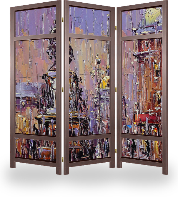 Описание ширмы Картина маслом , написана мастихином (Мастихин (от итал. mestichino) — специальный нож или мастерок, использующийся в масляной живописи для смешивания красок, очистки палитры или нанесения густой краски на холст. Иногда мастихин употребляется вместо