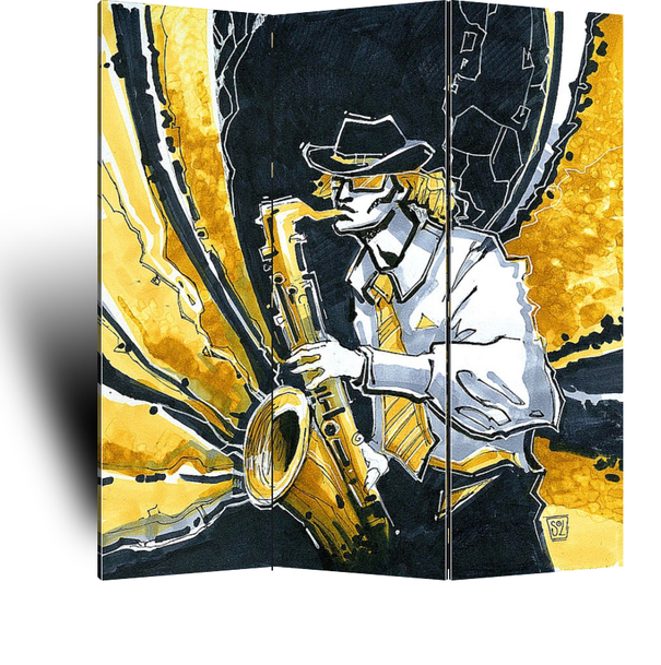 Описание ширмы маркерная графика. Музакант отчаянно дудит в саксофон. Для любителей блюза и джаза самое оно.