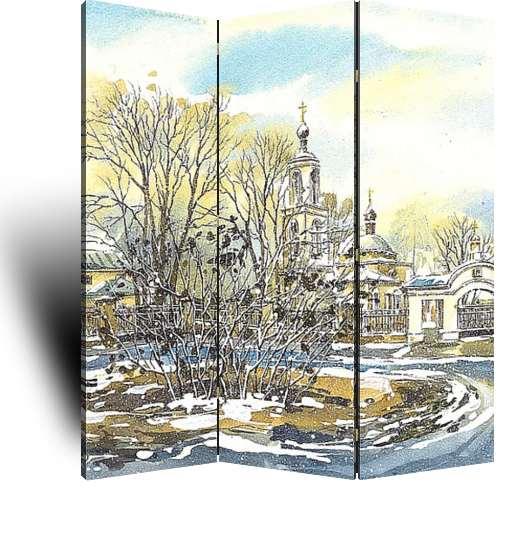 Описание ширмы На картине изображена Ратминская церковь в Дубнинском районе. Вдохновил первый снег. Материалы: бумага, акварель, тушь. Год создания 2002. Автор: Авдеева Светлана