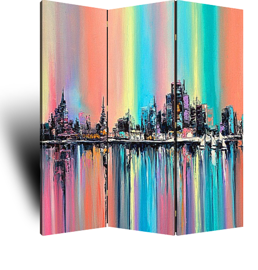 Описание ширмы Фантазия на тему городского пейзажа - урбанистический пейзаж с белоснежными парусными яхтами в радужных тонах отражающихся в воде.