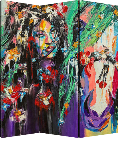 Описание ширмы Девушка с лошадью, картина написана в стиле импрессионизм, прекрасно подходит для украшения и придания красок любому интерьеру.