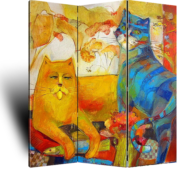Описание ширмы Счастье кота- иметь теплый дом, хороших хозяев, рыбку в лапах. Эта картина- о братьях наших меньших, о том, что у каждого кота свой характер и повадки. Коты- как люди
