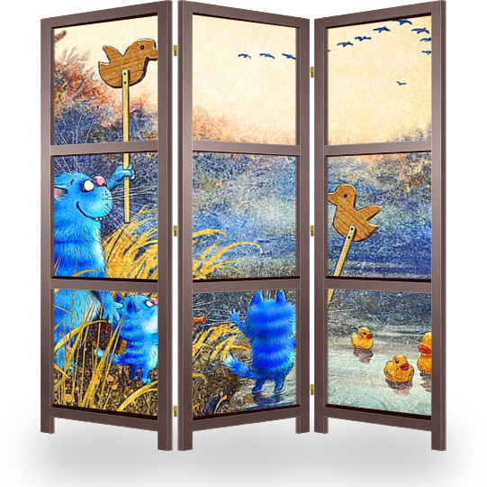 Описание ширмы Октябрь, река. В небе косяки перелётных птиц. Синий кот-отец привёл на берег своих котяток, учит их охотиться на уток. На воде плавают резиновые "подсадные" утки, в лапах "чучела". Удачной охоты!)