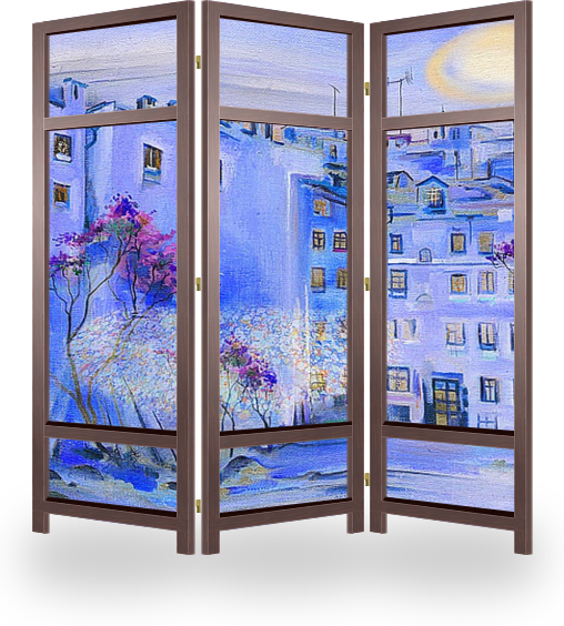 Описание ширмы Городские пейзажи Санкт-Петербурга освещены более мягким и близким светом, причем источником его может быть как обыкновенный фонарь, так и блуждающее радужное пятно, прикрытое лёгким утренним туманом после дождя.