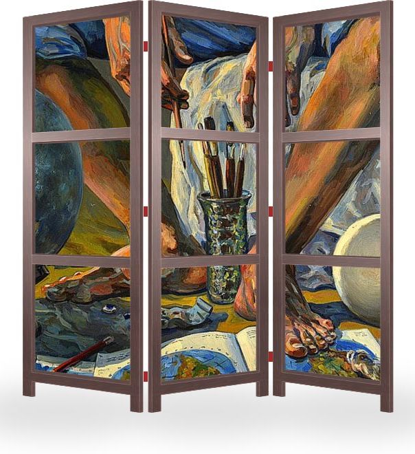 Описание ширмы Учебная работа на тему рисования ног и рук модели. В данном случае моих ног через зеркало. Получилась своего рода постмодернистская икона - Бог в момент сотворения мира. В качестве Луны был использован гипсовый шар, а вместо Солнца свет софита ( кото
