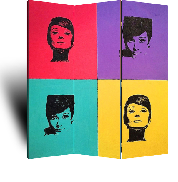 Описание ширмы Картина Одри Хепберн написана в ярких цветах которые присущи стилю поп-арт, она будет ярким пятном в Вашем интерьере и станет местом притяжения взглядов. Прекрасно подойдет для квартиры, офиса,салона,общественного места.