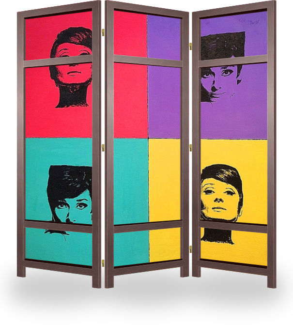 Описание ширмы Картина Одри Хепберн написана в ярких цветах которые присущи стилю поп-арт, она будет ярким пятном в Вашем интерьере и станет местом притяжения взглядов. Прекрасно подойдет для квартиры, офиса,салона,общественного места.