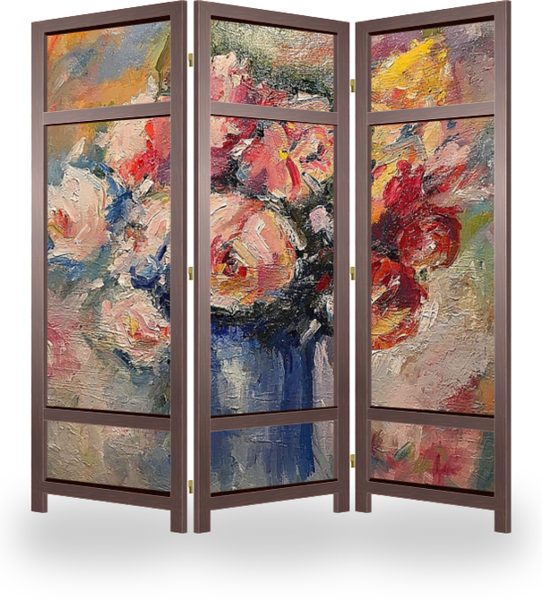 Описание ширмы Цветы украшение интерьера, работа написана в теплых тона и подойдет и будет украшать ваш дом,квартиру,офиса,ресторана или кафе. Отличный подарок на любой праздник. Холст,масло размеры 44*50 см.