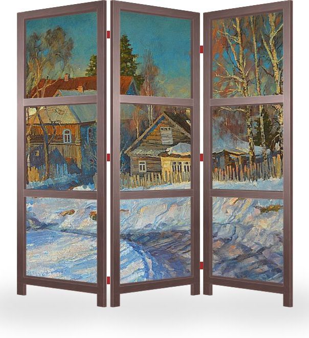 Описание ширмы Март.Ослепительное весеннее солнце.Весна света и таяния снега. На освещенных солнцем крышах лежат остатки снежного покрова. Рыхлый снег на земле и бегущие по нему синие, причудливые тени.Золотистые ветки берез создают изящный силуэт на фоне голубого