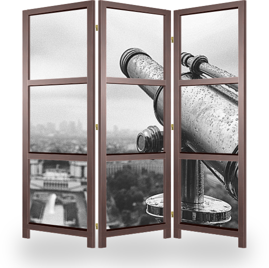 Описание ширмы Подзорная труба на Эйфелевой башне во время дождя. Внизу Париж в дымке и тумане. Капли дождя на подзорной трубе, фонтан внизу и силуэты многоэтажного Парижа.