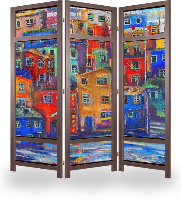 Описание ширмы Городской пейзаж Италии освещен более мягким и близким светом, причем источником его может быть как обыкновенный фонарь, так и блуждающее радужное пятно, прикрытое лёгким утренним туманом.