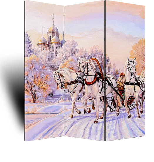 Описание ширмы Русская зима, определенно мотив сибирской природы, когда на закате дня серебрится иней, переливаясь от солнечно желтого до глубоких ультрамариновых тонов...тройка белых коней, запряженная в сани украшенные ручной росписью, несется по заснеженной доро