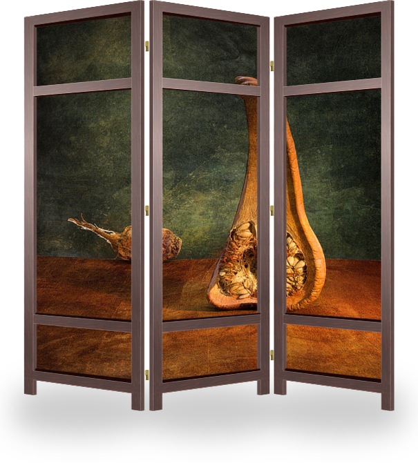 Описание ширмы Анатомия тыквы - это своего рода натюрморт, выполненный как стилизация под старину. Формы, положение предметов, их пространственная связь - вот главное "содержание" данного натюрморта.