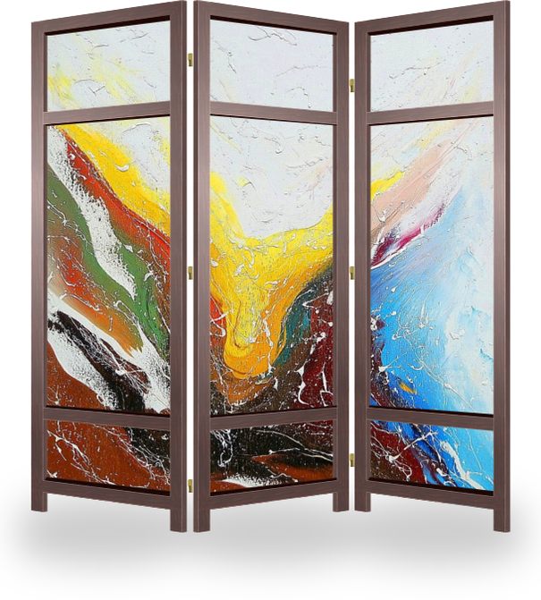 Описание ширмы Живописное полотно "Метаморфозы" (холст/масло, 90х70 см., 2015 г.) представляет собой абстрактную картину, аллегорическое изображение превращения, преобразования процессов, происходящих во вселенной.