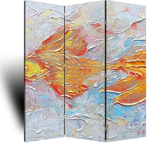 Описание ширмы Живописное полотно "Золотая рыбка" (оригинал - холст/масло, 30х70 см., 2016 г.) представляет собой изображение сказочного персонажа - волшебной рыбки, которая исполняет 3 желания.