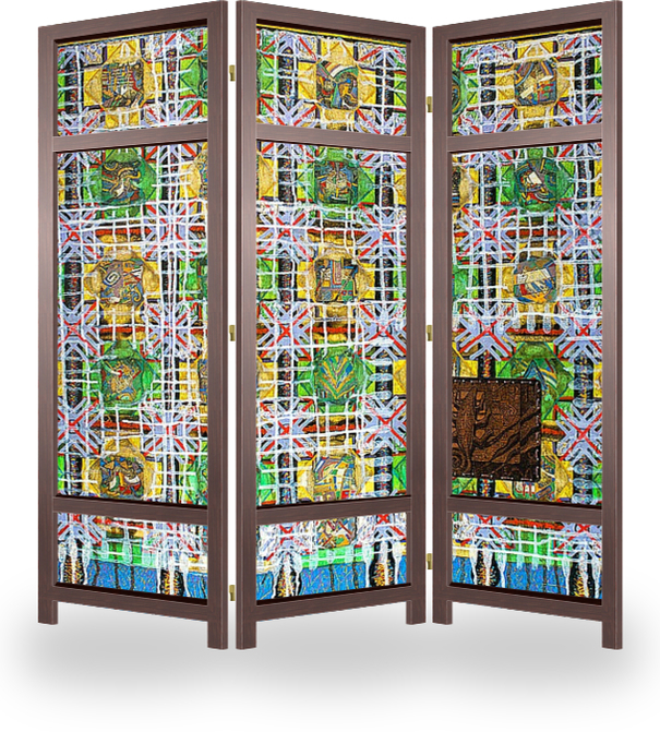 Описание ширмы Символическая композиция , абстракция , размер 70х85см . картон , масло , травление на меди. Работа представляет одно из направлений моего творчества . Выполнена в 2000г. работаю в разных направлениях ( портрет , пейзаж , символические композиции , г