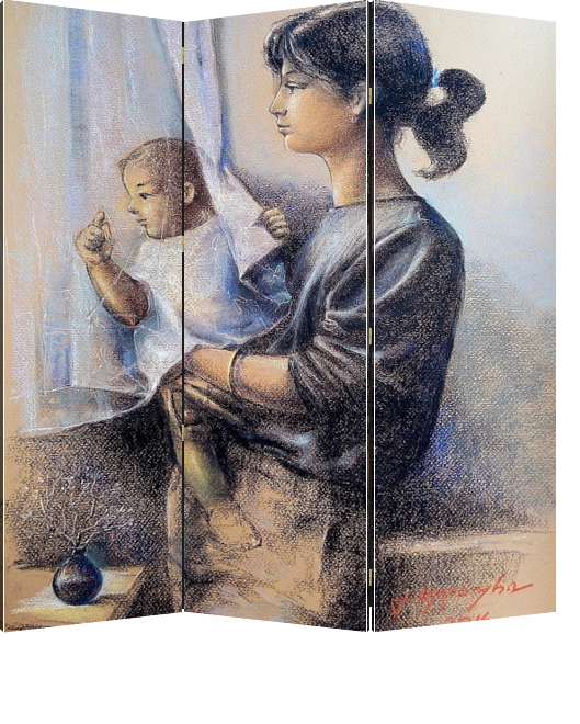 Описание ширмы Картина "Мать и дитя" (оригинал - графика, бумага / пастель, 70х50 см., 2016 г.) представляет графическую работу, исполненную сухой пастелью, изображающую мать с ребёнком на руках, задумчиво смотрящую в окно.