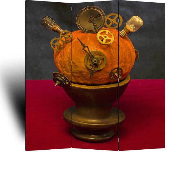 Описание ширмы "Будильник. Без пяти семь." - продолжает серию натюрмортов с тыквой. Это попытка заставить обычные предметы показать свои скрытые возможности в необычной для них ситуации или положении... Попытка открыть новую историю их существования.