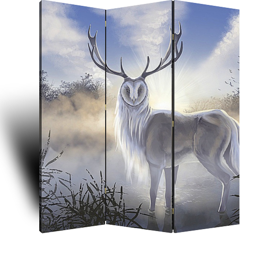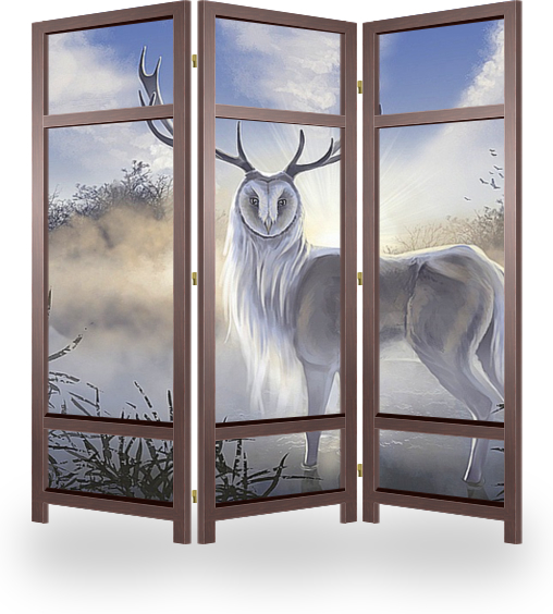 Описание ширмы Во всех мифологиях туман является «пороговым» состоянием; в густом тумане два мира сближаются и переплетаются один с другим, поэтому в сказочных историях иногда волшебные существа появляются из тумана или таинственной дымки.
