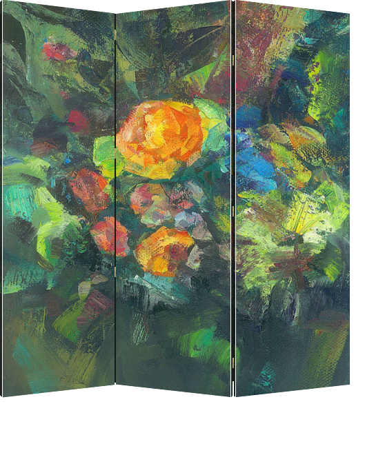 Описание ширмы живописный холст с изображением осенних цветов. художник стремился передать состояния "бабьего лета"-золотого теплого цветового состояния холста. Работа находится в собрании художника
