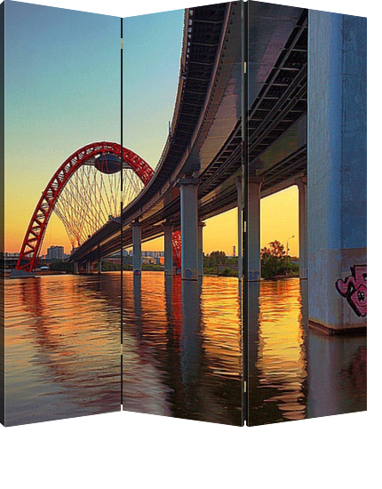 Описание ширмы Особенностью данного моста является его конструкция — пилон выполнен в виде арочной конструкции с веерным расположением вант, перекинутой с одного берега реки на другой, причём мост пересекает реку под острым углом. По обе стороны моста, за исключени