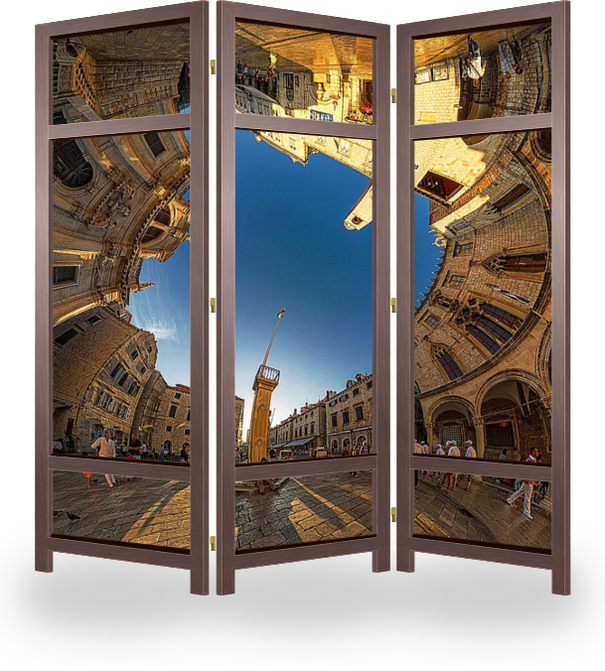Описание ширмы На данной фотографии изображена площадь в Дубровнике (Хорватия). Фотография сделана из сферической панорамы спроецированной на специфическую проекцию. Должно быть так выглядит мир из кроличьей норы.