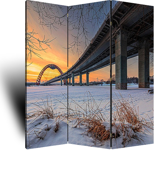 Описание ширмы Особенностью данного моста является его конструкция — пилон выполнен в виде арочной конструкции с веерным расположением вант, перекинутой с одного берега реки на другой, причём мост пересекает реку под острым углом. По обе стороны моста, за исключени
