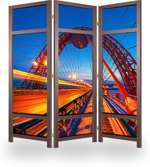 Описание ширмы Особенностью данного моста является его конструкция — пилон выполнен в виде арочной конструкции с веерным расположением вант, перекинутой с одного берега реки на другой, причём мост пересекает реку под острым углом. По обе стороны моста, за исключени