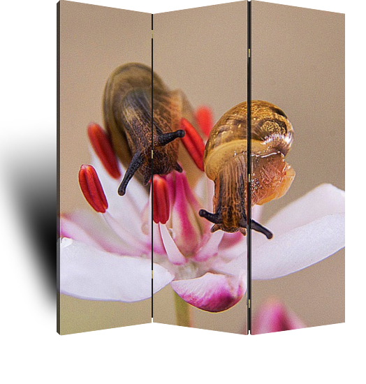 Описание ширмы Сибирские просторы. Речные закаты на Оби. Множество островов и проток. Один из островов густо населён улитками. Они повсюду. Цветы и улитки. Сочетание достойное внимания.