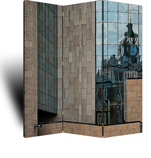 Описание ширмы Еще один кадр отражающий соседство или «противостояние» прошлого и будущего. В обеих столицах России подобное встречается нередко, особенно в центре города. На фото видна геометричность современного корпоративного здания и «тающее» отражение доходног