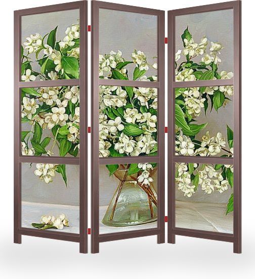 Описание ширмы Мелкие цветки душистого жасмина будут служить украшением любого интерьера. Картина написана в немного холодном колорите, что подчеркивает изящество букета