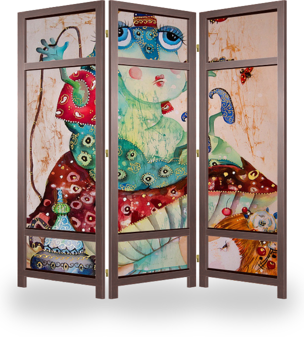 Описание ширмы Оригинальная картина выполнена в технике "горячий батик" специальными красками. Картина проработана мелким орнаментом. Подойдёт для оформления гостиной, спальни, детской По мотивам сказки "Алиса в стране чудес"