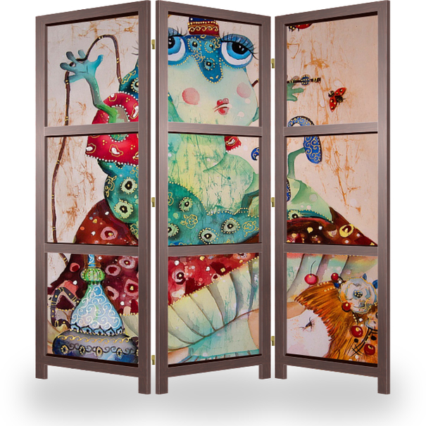 Описание ширмы Оригинальная картина выполнена в технике "горячий батик" специальными красками. Картина проработана мелким орнаментом. Подойдёт для оформления гостиной, спальни, детской По мотивам сказки "Алиса в стране чудес"
