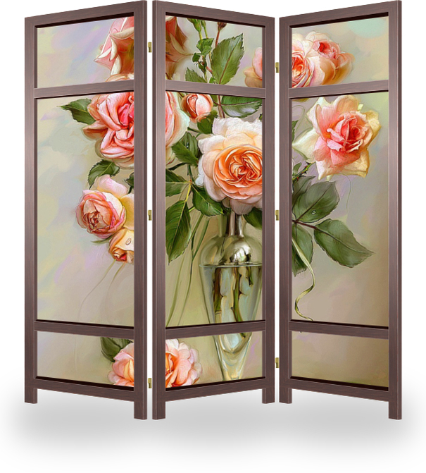 Описание ширмы На столике из светлого мрамора, в стеклянной вазочке стоит букет пышных роз. На столике лежит сломанная веточка и цветок. Работа украсит уголок Вашей комнаты.